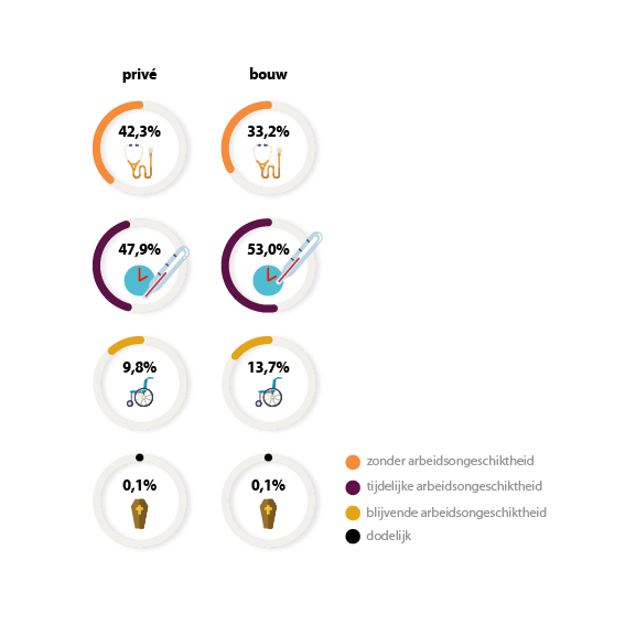 Het is duidelijk dat werken in de bouwsector een groter risico met zich meebrengt: een derde van de arbeidsongevallen blijft zonder gevolg, wat betekent dat bijna 67,7% leidt tot een of andere vorm van arbeidsongeschiktheid. Ten opzichte van 2017 zijn deze verhoudingen zijn onveranderd gebleven, zowel in de privésector als in de bouwsector.