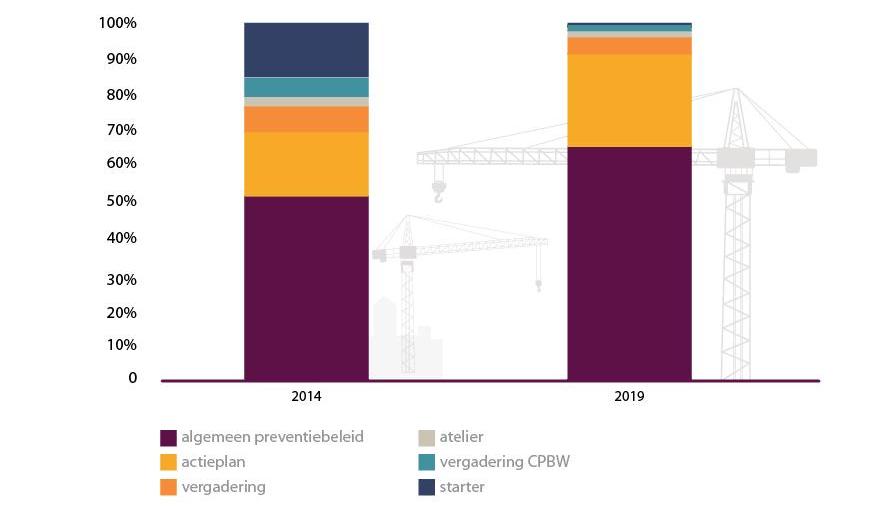 Uit deze grafiek blijkt dat een bedrijfsbezoek in 2019 vaak gericht was op ofwel het algemene preventiebeleid, ofwel het op maat maken en/of opvolgen van een actieplan voor het bouwbedrijf.